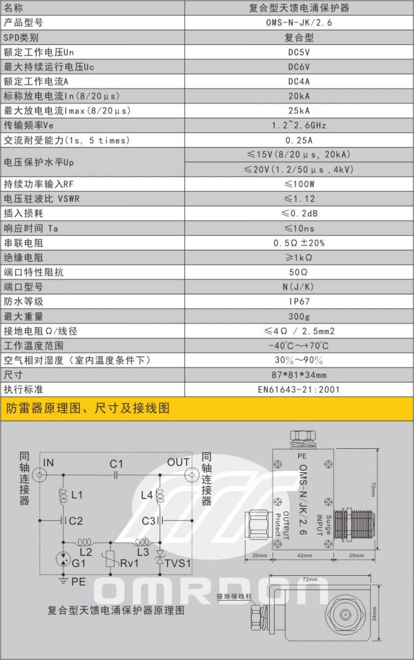 歐姆雷盾(OMRDON)1.2-2.6G天饋電涌保護器(SPD、防雷器)是專門為GPS/BD通訊基站通信頻段收發(fā)系統(tǒng)設計,使其免遭由天饋線引入的感應雷擊及靜電放電等過電壓損壞。本產(chǎn)品具有防水、防塵功能,可用于室外安裝場所。