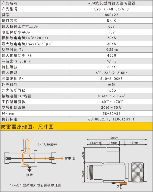 1/4波長型5.8G天饋電涌保護器(天饋避雷器、天饋防雷器)OMS-λ/4N-JK/5.8-