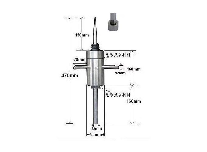 在雷電放電之前的高靜態(tài)電場特性情況下,OML-ESE/F3離子提前放電接閃器在針尖會產生可控幅度和頻率的脈沖,這使避雷針產生一個上行先導并向上傳播,從而截獲雷云里發(fā)出的下行先導,達到最先放電的目的。由于其特殊設計的電離過程使之能較其他鄰近高點提前產生上行先導,從而達到最先放電的目的。這個觸發(fā)時間的提前值,被稱為預放電時間△T。這是考核預放電型避雷針(ESE型避雷針)性能的主要指標。