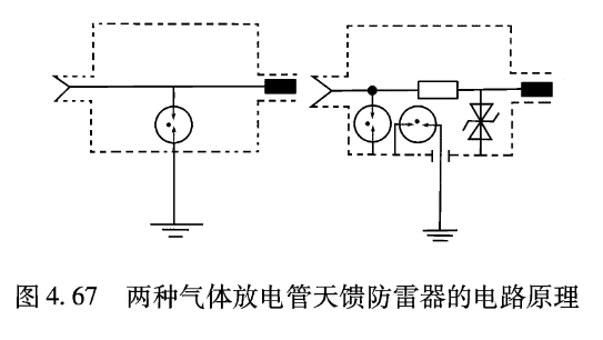②氣體放電管天饋防雷器:這是利用射頻信號與雷電流在強度上的差異,在同軸電纜內外導體之間并接氣體放電管,如圖4.67所示,借助雷電流自身的高壓擊穿短路來泄放雷電流的。與1/4波長防雷器不同,此時射頻信號也完全被阻斷,而按照上述同樣的雷電流來計算,通到設備的殘余能量為6.5mJ,比1/4波長防雷器的要高得多。不過,該防雷器的工作頻