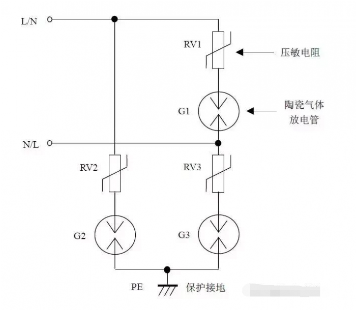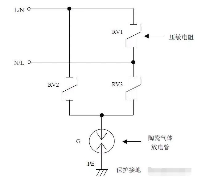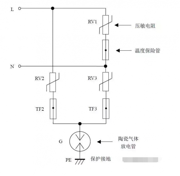 缺點(diǎn):壓敏電阻RV1短路失效后易引起火災(zāi)。最好在每個(gè)壓敏電阻上串聯(lián)一個(gè)工頻保險(xiǎn)絲以防壓敏電阻短路起火。如果L、N線不可能接反,則可省去壓敏電阻RV2、RV3,將放電管G的上端直接接到N線上,構(gòu)成“1+1”電路。