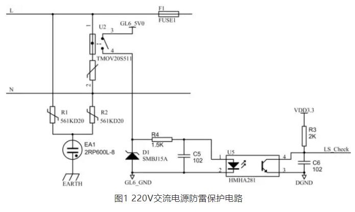 本電路由于采用了金屬氧化鋅壓敏電阻U2,因此能有效地避免傳統(tǒng)的氧化鋅壓敏電阻因短路失效可能帶來的火災(zāi)等安全隱患。與此同時,如果因為雷擊損壞時,其隔離的熔斷保險絲將同時熔斷,主機CPU可以在LS_Check端檢測到相應(yīng)的信號,從而起到雷擊損壞報警功能。