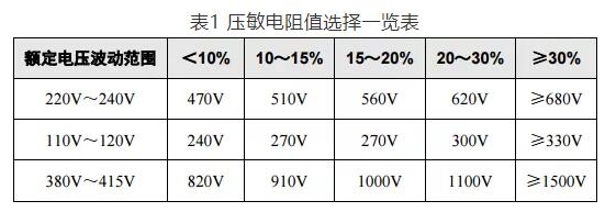 壓敏電阻的壓敏電壓值可參考表1選取,壓敏電壓值可以適當選高一點,這樣更安全、耐用,故障率低,但殘壓略高。然后根據(jù)通流容量要求選擇外形尺寸和封裝形式,或采用幾個壓敏電阻并聯(lián),注意應(yīng)挑選壓敏電壓值相近的并聯(lián),每個壓敏電阻都要單獨串聯(lián)溫度保險管,以延長使用壽命和確保安全。
